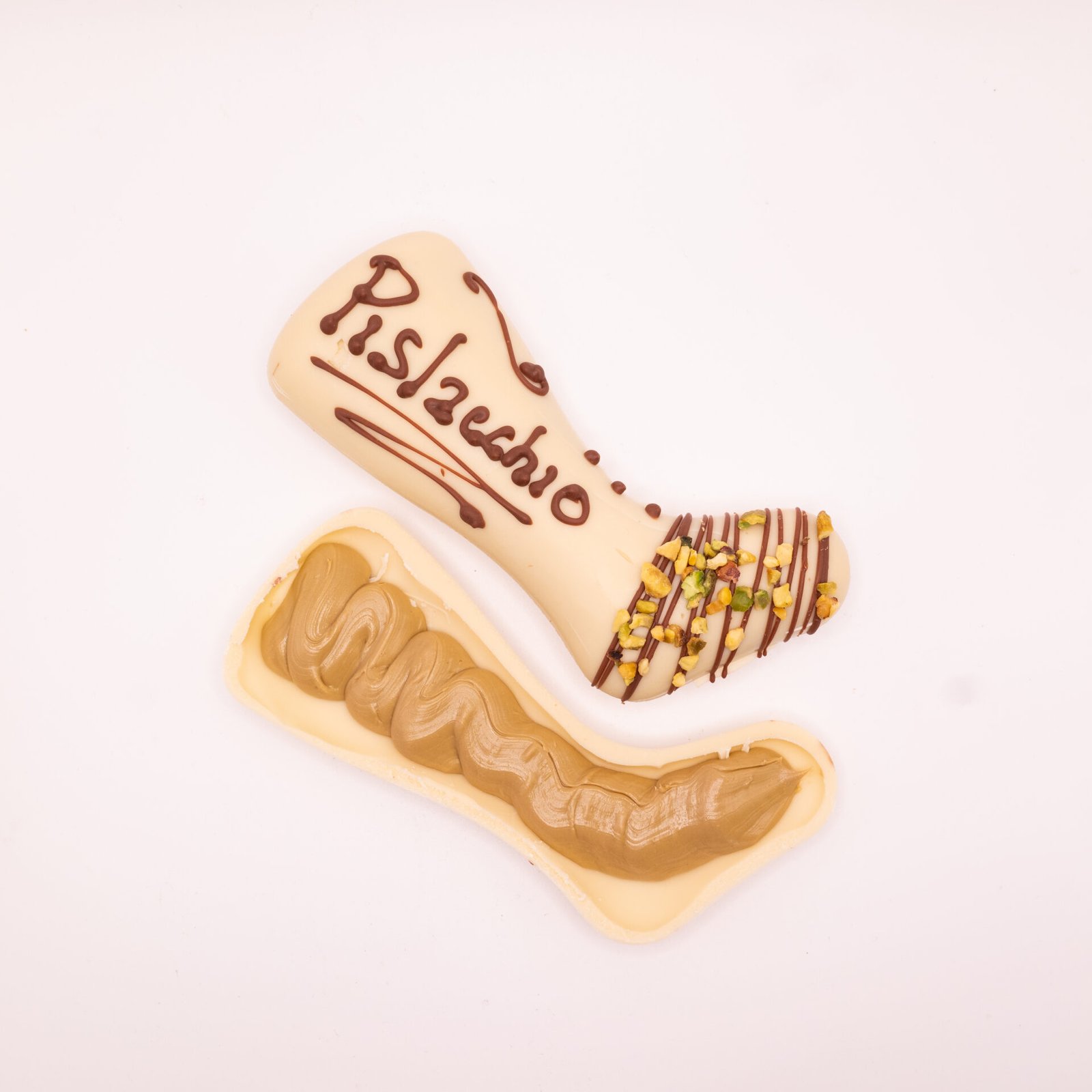 Calza di cioccolato bianco, ripiena di cremoso al pistacchio.