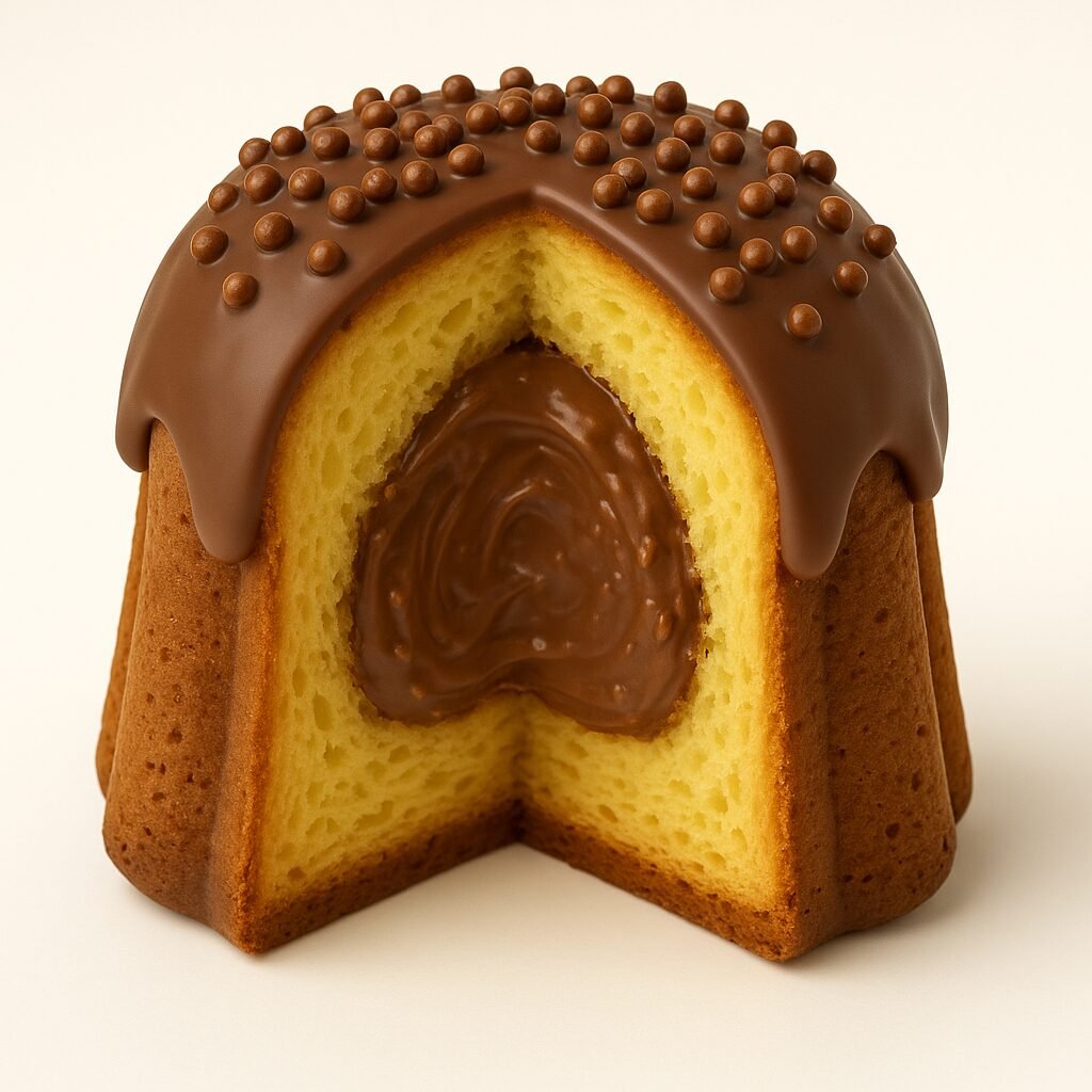 Pandorino artigianale con ripieno cremoso alla gianduia, ricoperto di cioccolato al latte e cerealini croccanti.