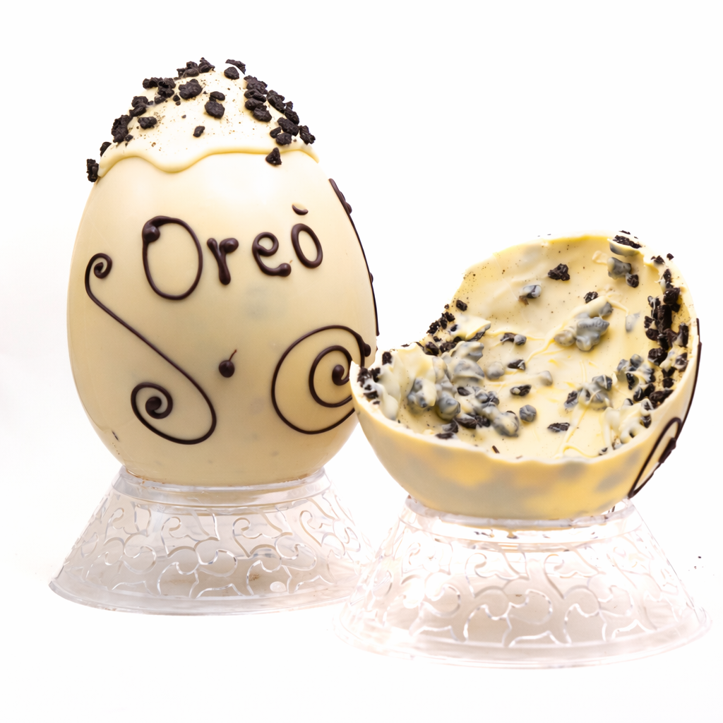 Uovo di cioccolato bianco con granella di biscotti al cacao.